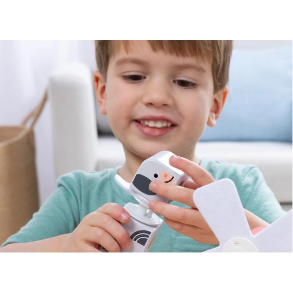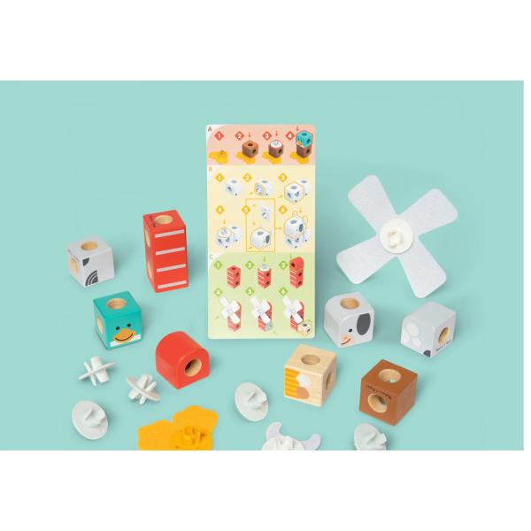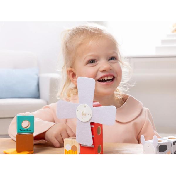 Hladké, barevné dřevěné kostky, které se snadno uchopují, do sebe zacvaknou díky velkým spojkám, které i malé ruce snadno zasunou a vytáhnou. Ilustrovaný průvodce ukazuje, jak uspořádat a spojit Blockables™, abyste vytvořili zvířata z farmy s různými texturami (koza, kachna, vejce) a rotující větrný mlýn.