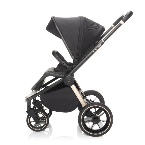 Velká, gumová kola s perfektním odpružením, prostorné polohovatelné sezení, výškově nastavitelná stříška, prodloužená opěrka na nožičky, zádová opěrka s odvětráváním, jízda po i proti směru, výškově nastavitelná rukojeť – to je kočárek Move Cross 2.