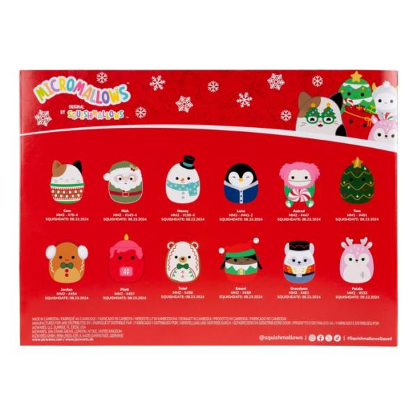 Squishmallows Micromallows Adventní kalendář je perfektní způsob, jak si užít vánoční období s těmito roztomilými plyšáky. Kalendář obsahuje 12 malých plyšových hraček, každou ukrytou za jedním z 12 okének, které můžete otevírat každý den až do Vánoc. Výška plyšáků je cca 6 cm. Obsahuje oblíbené vánoční postavičky jako Santa Claus, sněhulák, sob a mnoho dalších s vánočním motivem.