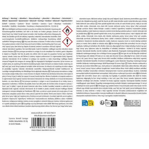 Použitím nevhodného ředidla se může barva zničit! Čistí se ředidlem Revell Aqua Color Clean. Na stříkání se doporučuje ředění maximálně 20 – 25 %. Štětec a pomůcky ihned po použití vypláchněte vodou. Nádobku po použití pevně uzavřete. Po otevření spotřebujte co nejdříve, barva přístupem vzduchu zasychá. Chraňte před mrazem. Obsahuje Směs látek 5-chlor-2methylisothiazol-3(2H)on a 2-methylizothiazol3(2H)-on s chloridem hořečnatým a dusičnanem hořečnatým. Může vyvolat alergickou reakci.