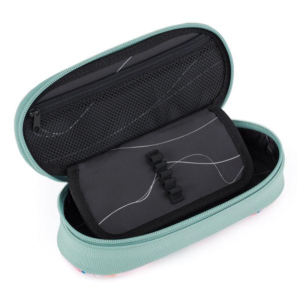 Uvnitř pouzdra je síťová kapsa na zip a klopa, na které jsou umístěny gumičky pro uchycení celkem devíti psacích potřeb, které je třeba mít po ruce přehledně uspořádané. Prostor pod klopou umožňuje volně umístit další psací potřeby – pastelky, fixy a různé drobnosti.