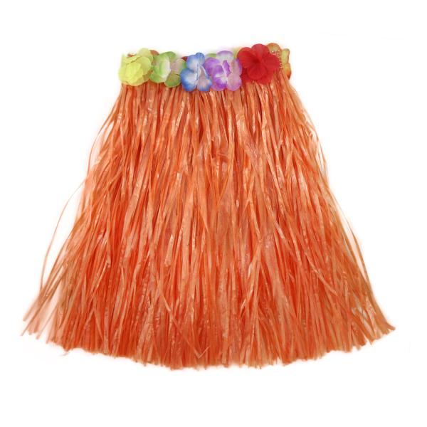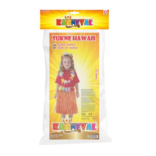 Parádní sukně ve stylu „Hawaii“ nesmí žádné slečně v šatníku chybět! Sukýnka je určena pro holčičky ve věkovém rozmezí 3-10 let (104-150 cm). Tento senzační kousek je ideálním doplňkem na karneval nebo k typickému havajskému tanci „HULA“. Sukně, dlouhá 45 cm, je vyrobena z tenkých igelitových pásků v oranžové barvě a zdobená barevnými okvětními lístky. Paráda! Staň se hvězdou karnevalového večírku díky této havajské sukni nebo si vytvoř celý havajský kostým! Balení obsahuje pouze sukni.