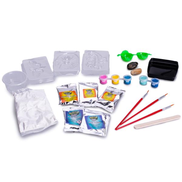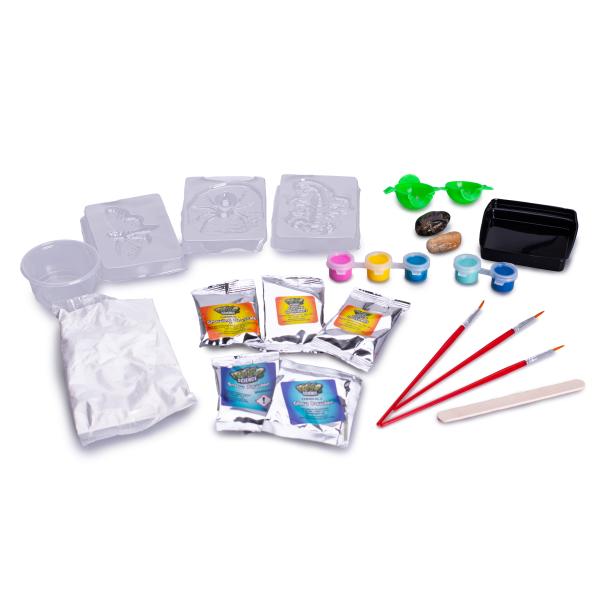 Obsahuje: 1x háček s zářícími nálepky, 3x štětce, 5x barvy, 2x balení polymerních krystalů, 1x plísněná forma, 2x kameny, 1x balení sádry, 1x balení rostoucích krystalů 1x balení zářivého prášku, 1x dřevěná tyčinka, 1x PVC podložka, 3x Forma na hmyz a 1x Nádoba na míchání