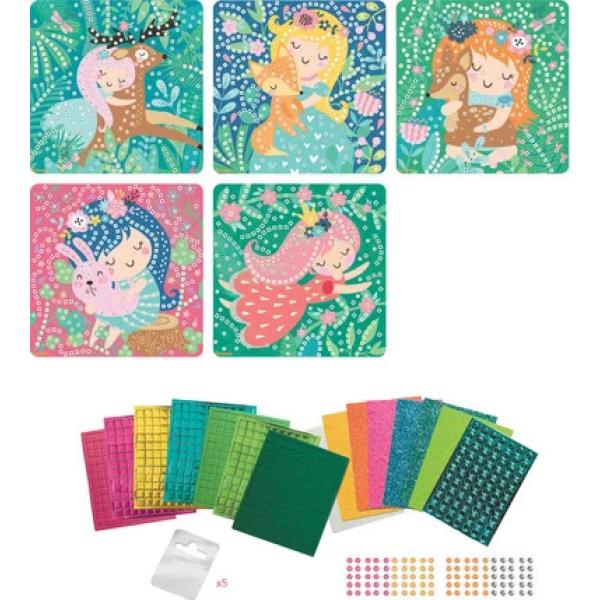 Kreativní volnočasová aktivita pro děti od 5 let. Děti si pomocí pěnových dílků dozdobí 5 efektních obrázků. Podle předlohy děti nalepují kulaté a čtvercové mozaikové dílky. Pro ještě krásnější efekt si obrázky dozdobí kamínky. Pomocí přiložených držáků snadno vytvoříte závěsnou dekoraci na zeď v dětském pokojíčku. Zdobení mozaikou je zábava, která rozvíjí jemnou motoriku, koncentraci a trpělivost vašeho dítěte.