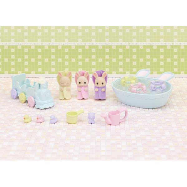 Trojčata Owen, Isla a Iris jsou nejnovějšími přírůstky v rodině mléčných králíků a přicházejí v zábavné koupelové sadě. Sada obsahuje tři malé figurky pokryté měkkým semišovým kožíškem a množství doplňků. Trojčata jsou oblečena do zábavných, barevných županů a každé z trojčat má jiný výraz tváře. Hračky Sylvanian Families rozvíjejí představivost a podporují děti v hraní rolí. Hraní s figurkami Sylvanian Families rozvíjí kreativitu a učí emoce prostřednictvím vytváření a vyprávění příběhů na základě každodenních zkušeností a pozorování světa. Vyznačují se nejvyšší kvalitou a výjimečným důrazem na detaily. Oblečení je vyrobeno tak, aby se dalo opakovaně svlékat a oblékat. Obsah: 3 figurky, vanička, 3 gumové kachničky, vozítko ve tvaru vláčku, šampon, kyblík a konvička. Balené v krabičce. Rozměry balení: 15 x 20 x 5,5 cm. Věk: 3+