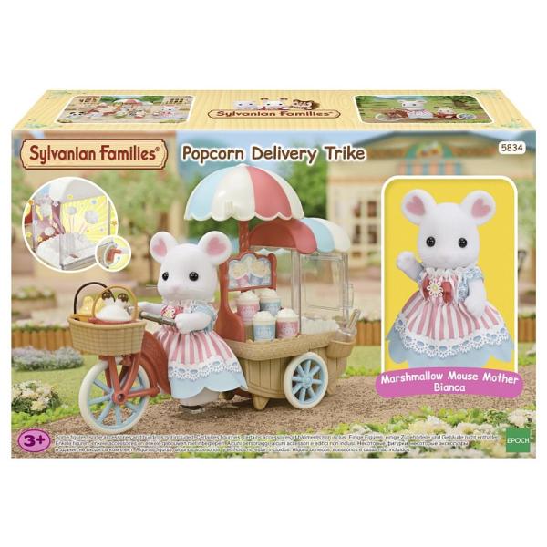 Sada Popcorn pojízdný stánek obsahuje figurku maminky Biancy z rodiny Marshmallow myšek v krásných šatech, tříkolku s popcornem a veškeré příslušenství potřebné k tomu, abyste si mohli užívat obsluhu stánku s popcornem.
