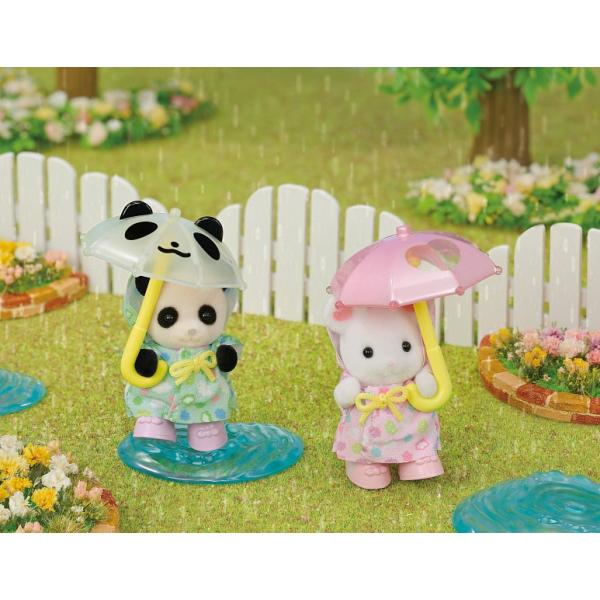 Tato sada je dodávána s roztomilými deštníky, holínkami a dokonce i kaluží – ideální na hraní v deštivých dnech. Deštníky padnou miminkům do rukou. Miminka mají oblečené pláště s roztomilým obláčkovým vzorem. Holínky mohou nosit i miminka.