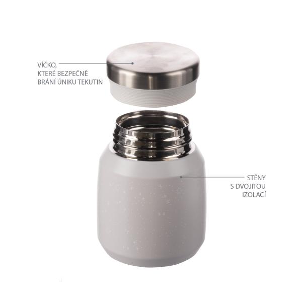Vysoce kvalitní termoska na jídlo a občerstvení s objemem 300 ml udrží teplé jídlo až 12 hodin a studené jídlo až 24 hodin. Je vyrobena z kvalitní nerezové oceli, která je odolná proti korozi. Těsně přiléhající víčko zajišťuje, že termoska nevyteče. Díky vakuové izolaci se termoska při naplnění horkým obsahem zvenku nezahřívá.