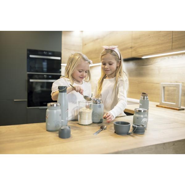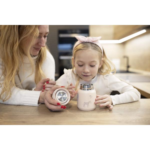 Společník na každý výlet Ve srovnání s plastovými dózami materiál z nerezové oceli neabsorbuje pachy a je odolný vůči skvrnám. Kromě toho z ní při přenášení nevyteče tekutina, jak je tomu u plastových obědových boxů, které dobře netěsní. Díky širokému otvoru se termoska snadno doplňuje, plní nebo myje. Termoska uchovává ovoce a zeleninu déle čerstvé. Používáním termosek na tekutiny pomáháte snižovat spotřebu plastů. Termosku myjte ručně, není vhodná do myčky nádobí.