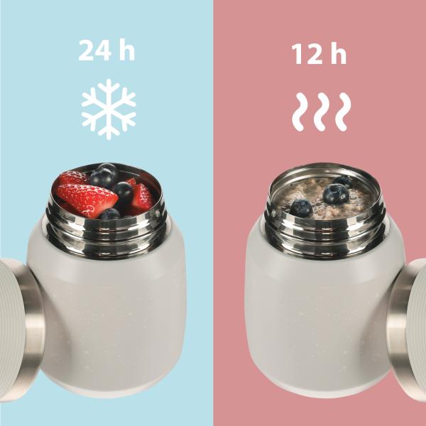 Vysoce kvalitní termoska na jídlo a občerstvení s objemem 300 ml udrží teplé jídlo až 12 hodin a studené jídlo až 24 hodin. Je vyrobena z kvalitní nerezové oceli, která je odolná proti korozi. Těsně přiléhající víčko zajišťuje, že termoska nevyteče. Díky vakuové izolaci se termoska při naplnění horkým obsahem zvenku nezahřívá.