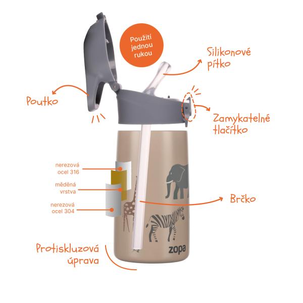 Termoska na pití s náustkem Zopa 400 ml – spolehlivá na každou cestuDětská termoska, která udrží nápoj teplý až 12 hodin a studený až 24 hodin. Bezpečná, neteče a jednoduše se používá i jednou rukou.
