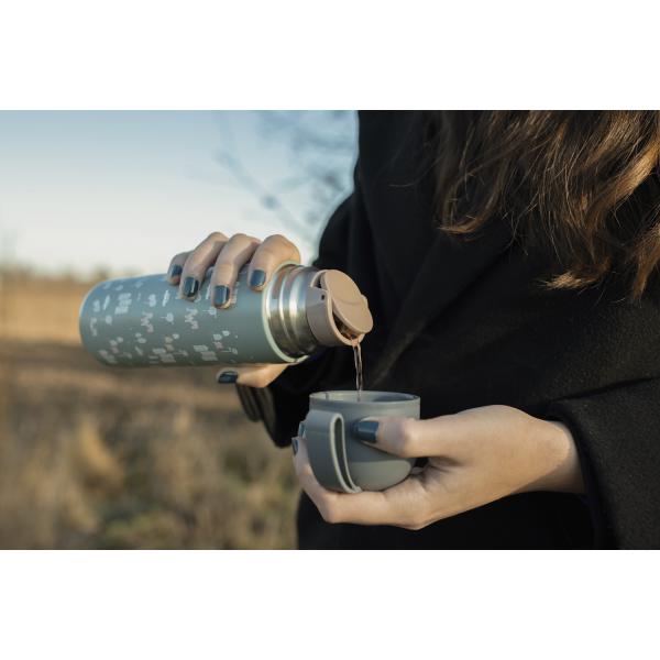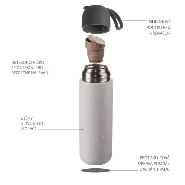 Díky vakuové izolaci se termoska při naplnění horkou tekutinou zvenku nezahřívá. Na pohodlné uchopení je termoska vybavena silikonovým držákem na nápoje. Používáním termosek na tekutiny pomáháte snižovat spotřebu plastů. Termosku umývejte ručně, není vhodná do myčky nádobí.