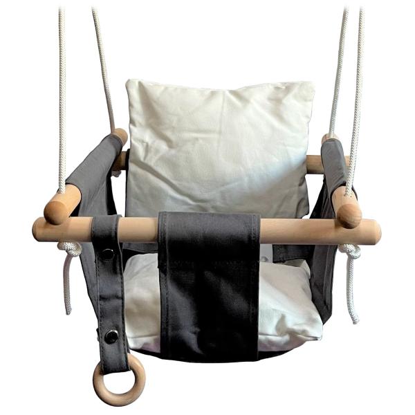 Dětská houpačka kombinující bavlněnou tkaninu a masivní dřevo, se 2 karabinami pro zavěšení a výškově nastavitelnými lany. Nezbytný pomocník pro nejmenší objevitele zábavy venku, na dětském hřišti. Hlavní vlastnosti: nosnost 50 kg výškově nastavitelné lano (max. 180 cm) odolná konstrukce z masivního dřeva