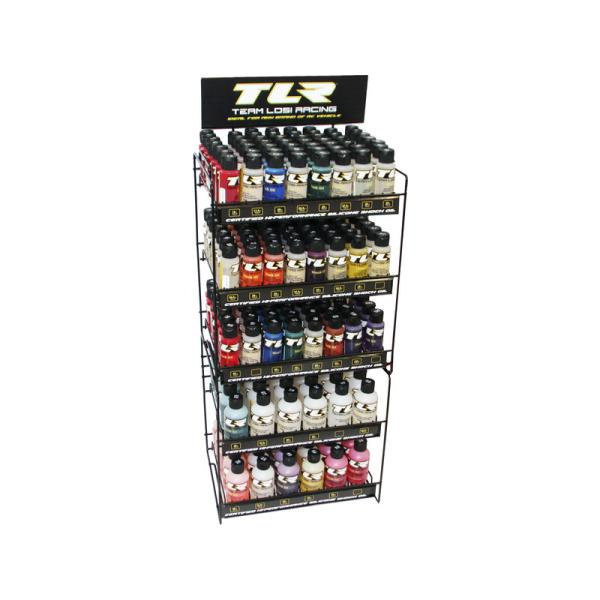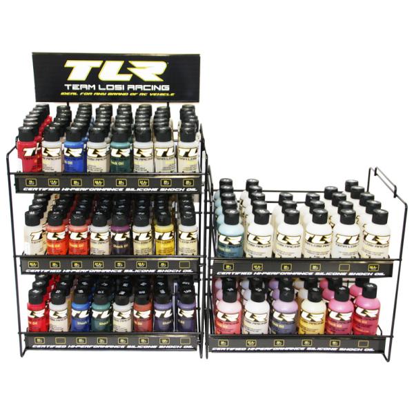 Charakteristika:Prodejní 2-dílný stojan pro silikonové oleje s logem Team Losi Racing. Obsahuje samolepky pro popis druhů olejů ve stojanu. Obsahuje 50ks lahviček o objemu 120ml a 161ks lahviček o objemu 60ml. Vyrobeno v USA v rámci přísných technických tolerancí TLR. Lahvičky 120ml jsou vhodné zvláště pro uživatele velkých aut 1:8, 1:5, která jsou opatřena velkými tlumiči.