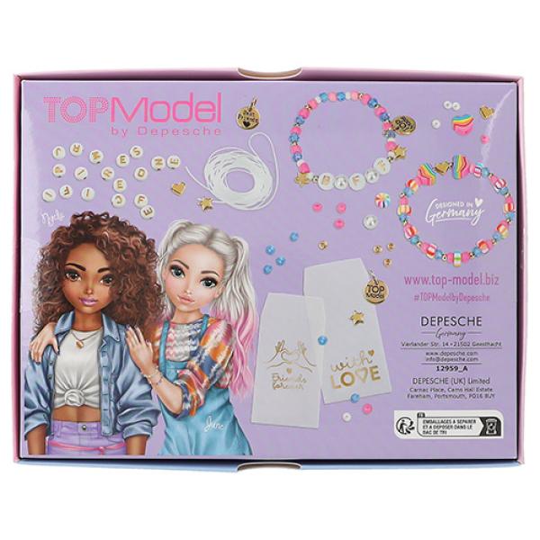 Tento kreatívny set od značky TOPModel je ideální pro malé kreativní duše. Sada obsahuje různé druhy korálků, včetně bílých a zlatých písmenných korálků, matných bílých skleněných korálků, barevných korálků z hlíny, světle modrých diamantových korálků, malých zlatých korálků, růžových skleněných korálků a perleťových korálků. Součástí balení jsou také zlaté kovové přívěsky ve tvaru loga TOPModel, srdíček a hvězdiček.