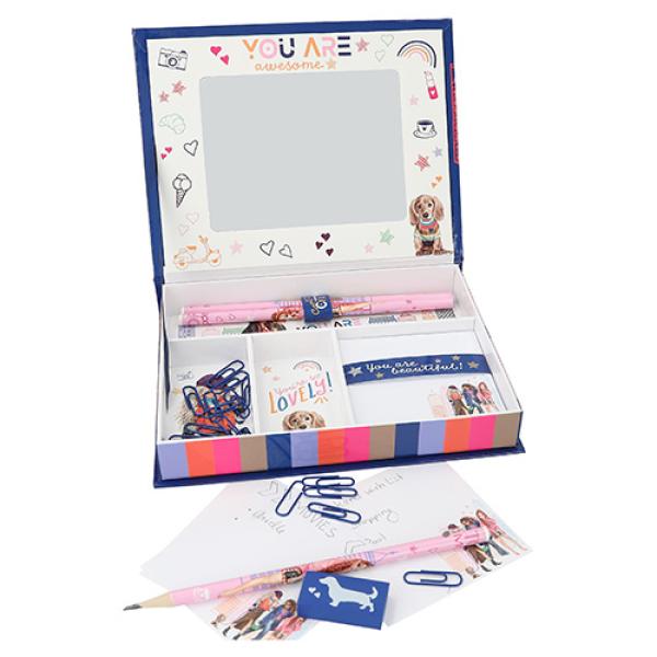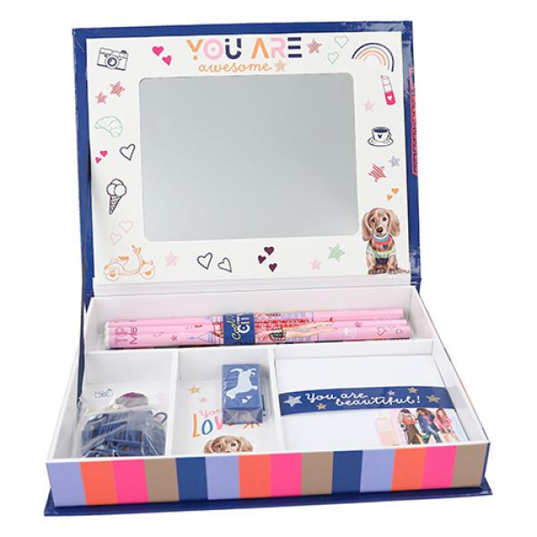 Sada je vybavena třemi barevnými tužkami s roztomilými vzory, gumou s potiskem, 25 růžovými kancelářskými sponami a 100 stránkovým růžovým notýskem. Na víku boxu se nachází zrcadlo.