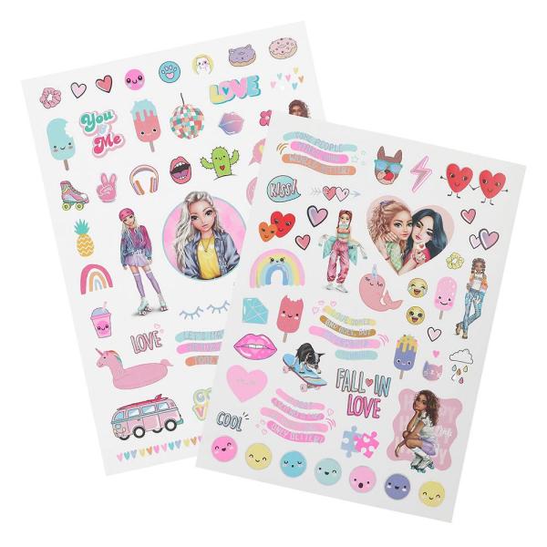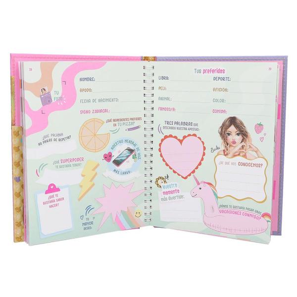 Kniha přátelství TOPModel „Mi Libro Maps“ je skvělý způsob, jak si uchovat vzpomínky na přátele a kamarádky. Desky v tvrdé vazbě z odolného materiálu jsou potištěny krásným, detailním motivem dvou TOPModelek – Candy a Fergie – oblečených v koordinovaných duhových svetrech, s jemnými detaily srdíček a hvězdiček.