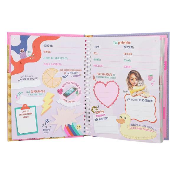 Hřbet zdobí zlaté srdíčkové vzory, které dodávají knize luxusní vzhled. Uvnitř knihy jsou připraveny tematické stránky na vyplnění detailů, odkazů, obrázků a malých tajemství, všechno ve španělštině.