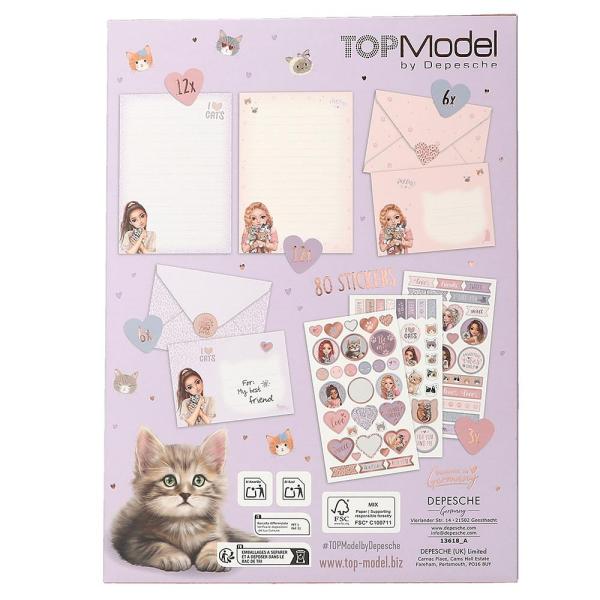 Sada obsahuje vše, co potřebujete na psaní a zdobení dopisů – najdete v ní 12 listů papíru na dopisy ve dvou motivech, 6 vhodných obálek a více než 80 stylových samolepek s motivy koťátek, srdíček a postaviček z Topmodelky. Pomocí nich si děti mohou kreativně ozdobit své dopisy a obálky.