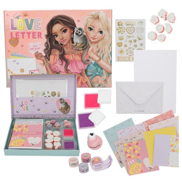 Uvnitř najdete barevné hlavy dopisů s krásnými motivy Top Model, roztomilé obálky na vaše vzkazy, různé obaly samolepek s tematickými obrázky a výroky, jako například „Pro tebe“, „Všechno nejlepší k narozeninám“ nebo „Děkuji“, sadu razítek s roztomilými motivy, jako jsou citrusy, květiny nebo opička, dva inkoustové polštářky v růžové a fialové barvě pro snadné používání razítek a ozdobné lepící pruhy, které vám pomohou doladit vzhled vašich výtvorů. Vše je přehledně uspořádáno v praktické krabičce s přihrádkami, takže všechny pomůcky budete mít vždy po ruce.