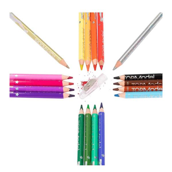 Nádherné barevné pastelky dobře ořezávají a snadno se s nimi kreslí a vybarvuje. Pastelky v atraktivním designu mimořádně oblíbené značky Top Model najdou kreativní využití ve škole i doma! Součástí balení je 18 různých barev pastelek a struhadlo. Tyto pastelky nemohou chybět žádné kreativní malířce! Věk 3+