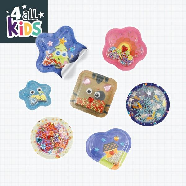 Stačí si vybrat průhledný obal, umístit ho na podložku a naplnit mikroperličkami, flitry, kamínky a samolepicími očky. Pomocí děrovačů a dekoračních papírů si mohou děti vytvořit vlastní konfety a dotvořit tak každý sticker podle svých představ.
