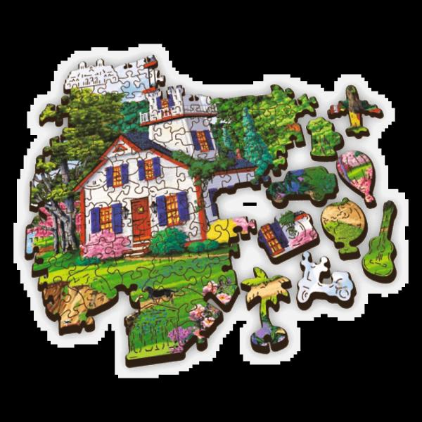 Dřevěné oboustranné puzzle se speciálně tvarovanými dílky. Puzzle je vyrobeno z pevné dřevovláknité desky a vyřezáno laserem, díky čemuž jsou okraje hladké a dílky do sebe snadno zapadají. Vysoká kvalita a precizní zpracování laserem, až 50 unikátně tvarovaných dílků, ostatní dílky v nepravidelných tvarech, puzzle je oboustranné – z jedné strany obrázek, z druhé strany vzor.