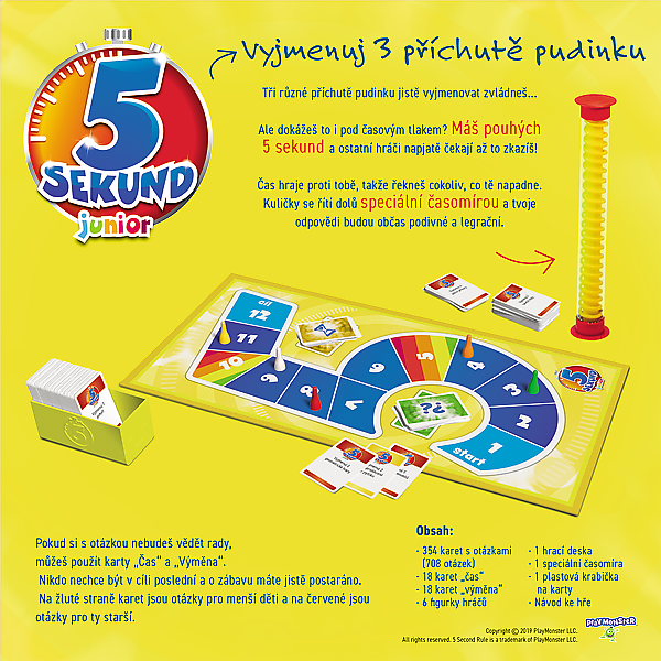 Dětská verze hry, která vás naučí rychle myslet a mluvit! V této hře je vaším cílem správně odpovědět na co nejvíce otázek. Tři různé příchutě pudinku určitě jmenovat zvládnete, ale dokážete to i pod časovým tlakem? Máte pouze 5 sekund a ostatní hráči netrpělivě čekají na vaše zaváhání! Hra obsahuje kartičky s otázkami ve dvou barvách- žluté pro mladší děti a červené pro starší. věk 6+