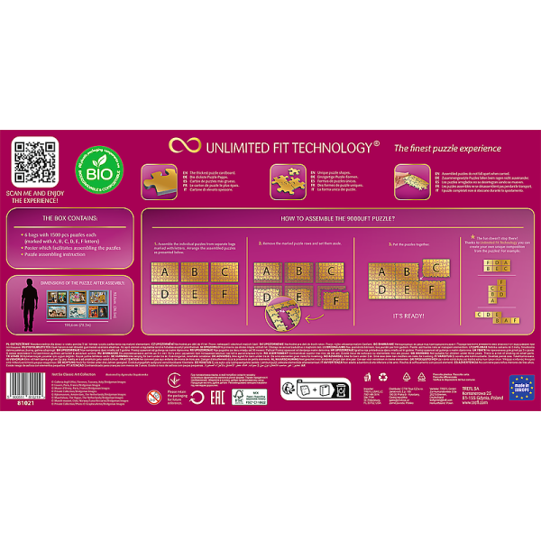 TREFL Unlimited Fit Technology (UFT) jsou puzzle neomezených možností. Díky této technologii si můžete z více obrázků poskládat velké puzzle koláže. technologie umožňuje napájení libovolného množství puzzle motivů ze série UFT nejvyšší kvalita – puzzle vyrobeno z nejsilnějšího modrého kartonového podkladu každý dílek má unikátní tvar Puzzle dílky drží u sebe a poskládané obrázky lze pohodlně přemísťovat rozměr: 198,6 x 92,8 cm 1 dílek: 1,4 cm Kadý obrázek balen samostatně 6×1500 dílků. Baleno v bio obalu – bez vrchní fólie. Sáček uvnitř je biologicky rozložitelný.
