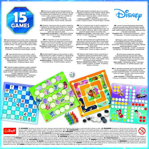 Sada klasických her pro celou rodinu s vašimi oblíbenými pohádkovými postavami! Sada obsahuje tradiční hry: člověče, mlýn, hadi a žebříky a dámu v různých verzích známých po celém světě. Obsah balení: 2 oboustranné desky 1 kostka 24 figurek dáma 16 barevných figurek návod Počet hráčů : 2-4 Věk : 5+