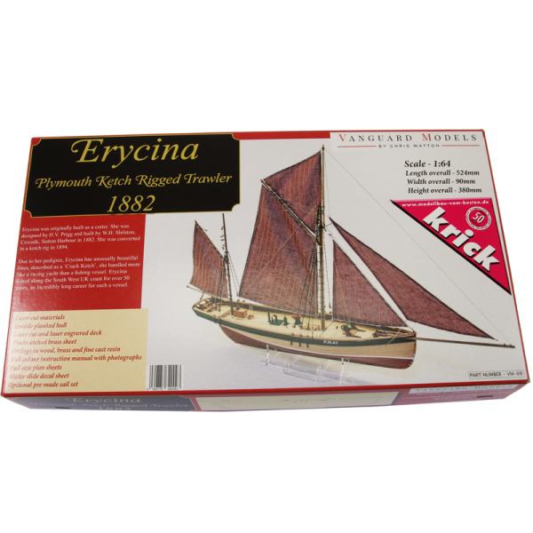 Charakteristika:Stavebnice modelu lodi Vanguard Models Erycina 1882 v měřítku 1:64. Délka modelu lodi je 524mm, stavba převážně ze dřeva s drobnými doplňky, součástí je i stavební plán. Laserem řezané a 3D tištěné díly.