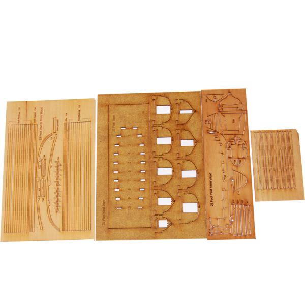 Laserem řezaná MDF stavební deska s výřezy pro stavbu kýlu a rámu