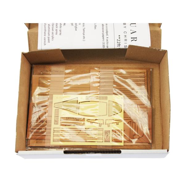 Po otevření víka krabice naleznete dřevěné díly modelu z překližky, sadu mosazných plošných dílů, sadu výkresů a manuál.
