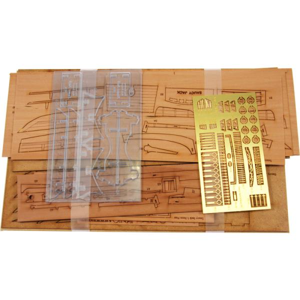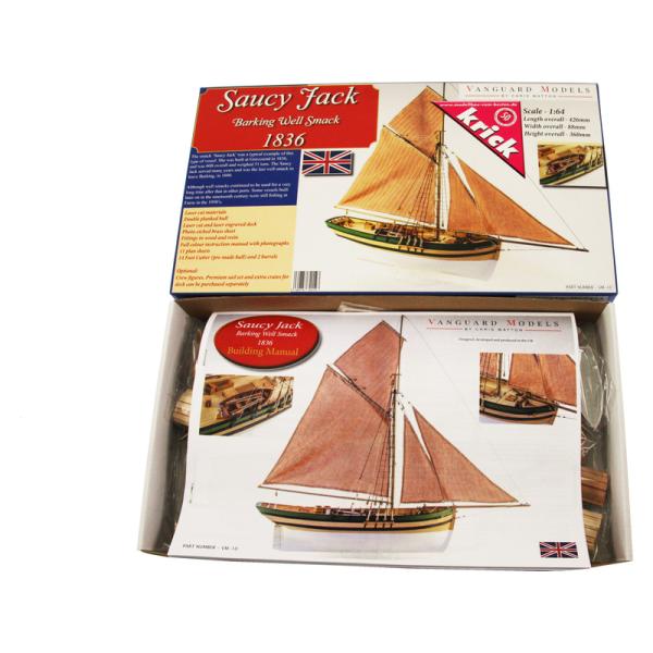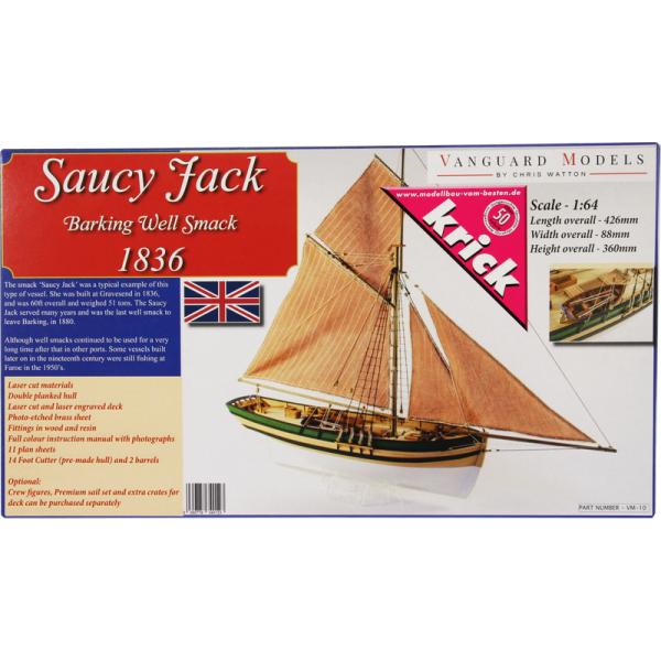 Charakteristika:Stavebnice modelu lodi Saucy Jack v měřítku 1:64. Délka modelu lodi je 425 mm, stavba převážně ze dřeva s drobnými doplňky, součástí je stavební plán. Laserem řezané a 3D tištěné díly.