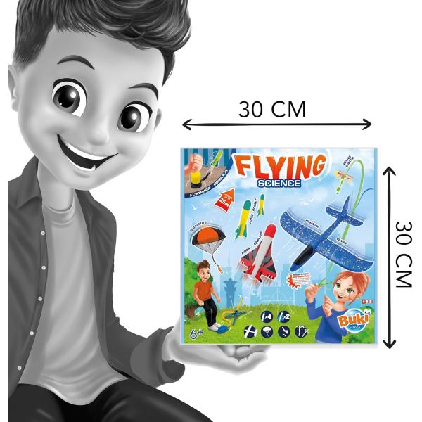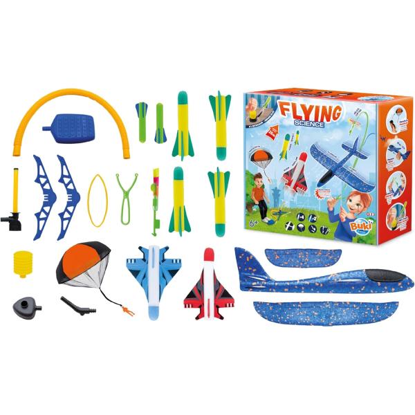 Objevte fascinující svět letectví s jedinečnou sadou hraček od Buki! Tento set vám umožní vyzkoušet až 6 různých létajících hraček venku i uvnitř. Set obsahuje 4 rakety, 2 proudová letadla, 1 kluzák, 1 vystřelovací vrtulník, 1 padák a 2 mini rakety.