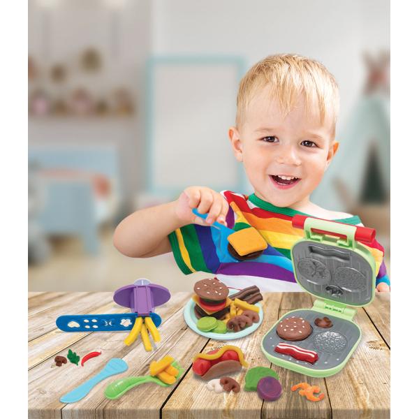 Plastelína, ve které jsou různé formičky a formičky pro výrobu hamburgeru. Včetně modelovací hmoty.