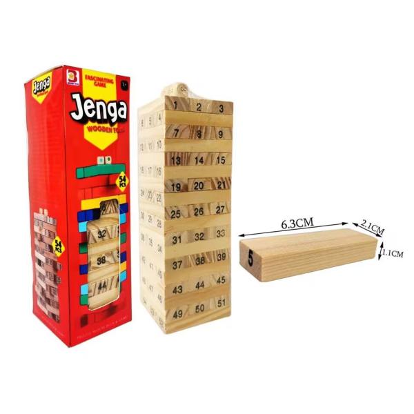 Věž dřevěná s čísly. 54 dílků. Rozměry poskládané věže 6,3×6,3×20 cm, jednoho dílku 6,3×2,1×1,1 cm.