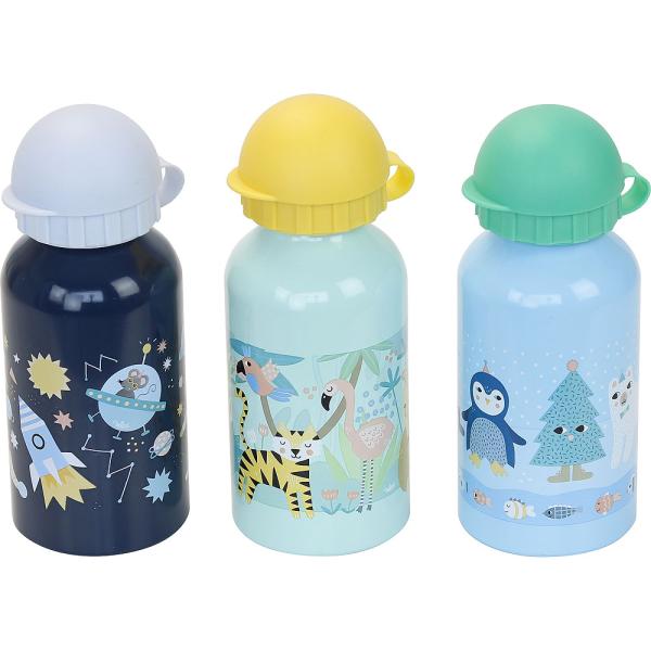 Kovové láhve na vodu s plastovým uzávěrem, můžete si vybrat mezi 3 ilustracemi Michelle Carlslund. Lahve jsou perfektní pro děti, naučí se díky nim dodržovat pitný režim. Láhve tmavě modrá vesmírná, světle modrá safari, blankytně…