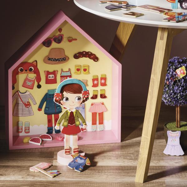 Oblečte Chloe do různých outfitů! Dřevěná, 22 cm vysoká, magnetická panenka s 37 magnetickými dílky oblečení a doplňků. Hlavní vlastnosti: 1 figurka na dřevěném podstavci vysoká 22 cm obsahuje 37 dílků oblečení a doplňků vyrobených ekologicky, šetrně k životnímu prostředí