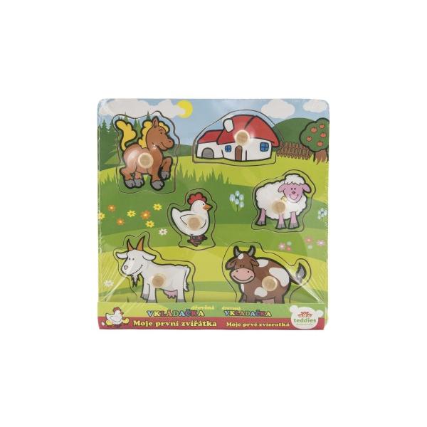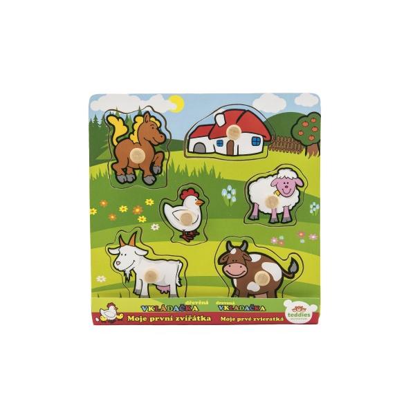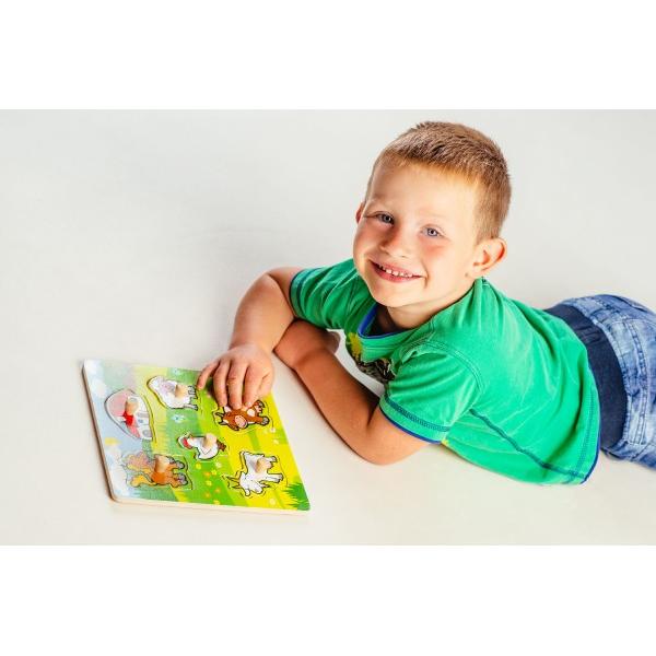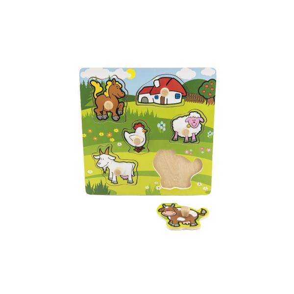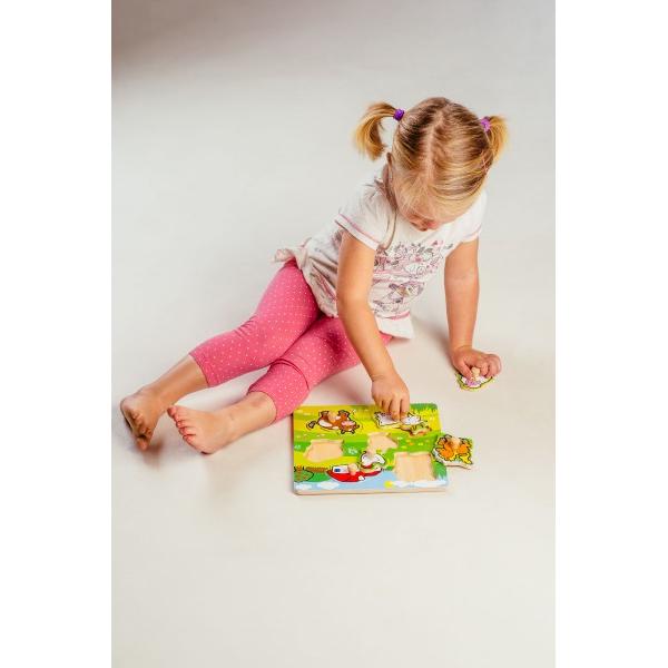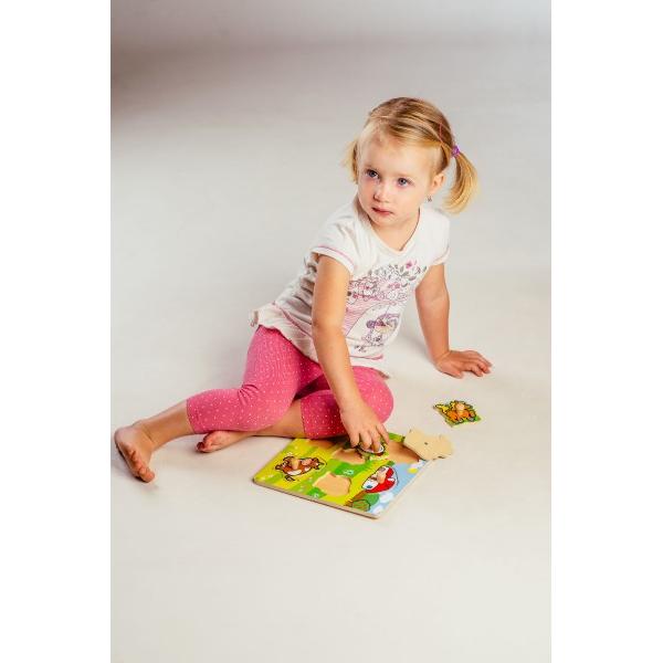 Obsahuje 6 dílků s úchyty, které musí děti správně umístit do dřevěné desky s otvory tak, aby získaly obrázek louky se zvířátky a domečkem. Velikost: 22,5 x 22,5 x 2,5 cm Vhodná od 12 měsíců