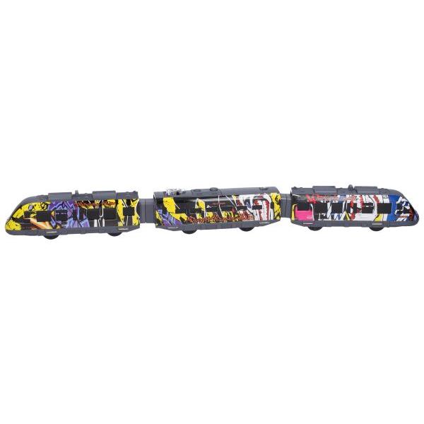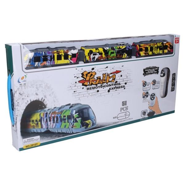Vlak graffiti set RC. Rozměry 117×66 cm, délka tratě 374 cm. Součástí mašinka a 2 vagóny, koleje, ovladač s přísavkou, stanice, výhybka, stromy, značky. Magnetické spojení vagónů. Světelné a zvukové efekty. Ovladač – jízda dopředu, jízda dozadu. 3xAA do vlaku, 2xAA do ovladače nejsou součástí.
