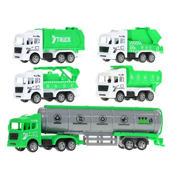 Vozidla úklidové služby na zpětný chod. Balení obsahuje pět různých vozidel.