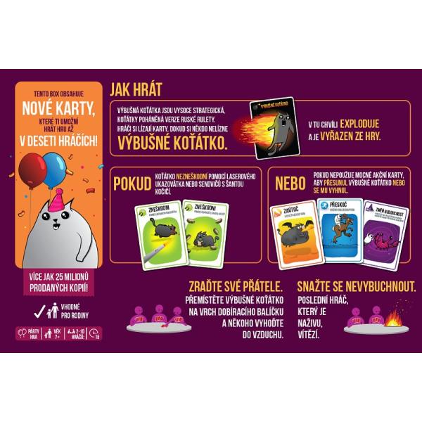„Pořádnou párty je třeba začít ve velkém stylu!“ Historické okénko Výbušná koťata je hra s historicky nejvíce přispěvateli na Kickstarteru. Hru vytvořili Elan Lee (XBOX, ARGs), Matthew Inman (The Oatmeal) a Shane Small (XBOX, Marvel), kteří přepsali historii Kickstarteru, když v roce 2015 na jejich projekt přispělo více než 219 000 backerů (přispěvatelů). K roku 2023 se prodalo více než 25 milionů kopií Výbušných koťat po celém světě. O hře Výbušná koťata Výbušná koťata jsou extrémně strategickou verzí ruské rulety (pouze s koťaty). Hráči si dobírají karty, dokud si někdo nelízne výbušné kotě, exploduje, umře a je vyřazen ze hry. Pokud ten hráč nemá kartu Zneškodni, která mu umožní zneškodnit kotě pomocí laserového ukazovátka, drcením na bříšku nebo sendviče se šantou kočičí. Úkolem všech ostatních karet v balíčku je pomoci hráčům držet se Výbušným koťátkem ze silnice (nebo je nastrčit do cesty ostatním). V čem je tato edice jiná? Toto balení obsahuje pořádnou porci karet (oproti Originální edici i karty s novými efekty), díky kterým si můžete zahrát hru až v deseti lidech! Obsah balení: 120 karet 1 CZ pravidla Věk 7+