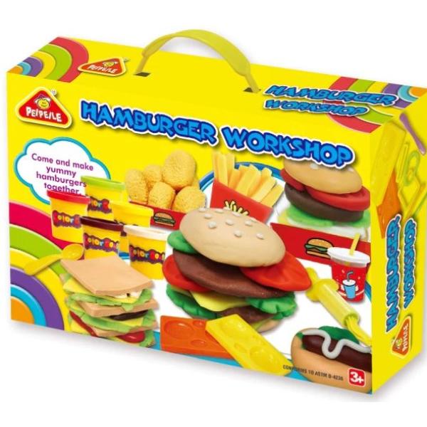 Hamburgerová dílna je zaručenou zábavou pro malé umělce na dlouhé hodiny. Modelína je bezpečná, netoxická, měkká a pružná. Modelína nevysychá pokud je uchovávána v dobře uzavřeném kelímku je možné ji používat znovu a znovu. Balení obsahuje : 5x uzavíratelný kelímek s modelovací hmotou, 2x formička na hamburger, 3x formička na krájení, 1x váleček, 1x lžíce, 1x Menu, 2x kelímek s víčkem a brčkem, 2x kelímek bez víčka, 4x zdob tvořítko, 3x krabička, 1x krabička na hranolky, 1x čepice Pro děti od 3 let