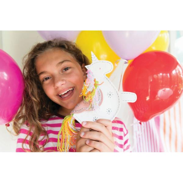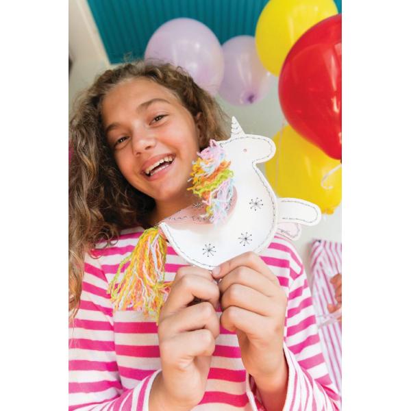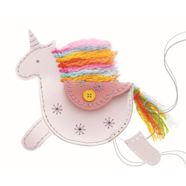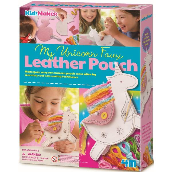 Naučte se základní kožené řemeslné techniky pro vytvoření tašky s jednorožcem. Kabelka je dlouhá cca 7,5 cm. Obsahuje sadu předřezané šablony z umělé kůže, 1 knoflík, 1 pár jehel, 1 cívku stříbrné nitě, 5 barevných nití a podrobný návod. Zábavné a jednoduché. Od 5 let