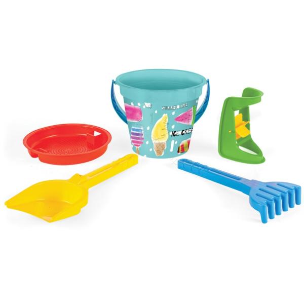 Sada obsahuje 5 prvků: lopatku, hrábě, mlýnek, sítko a kbelík (2 l) se zajímavou grafikou vyrobené metodou IM. Všechny prvky jsou vyrobeny z kvalitního, atestovaného, odolného a bezečného plastu. Vhodné pro děti od 1 roku.