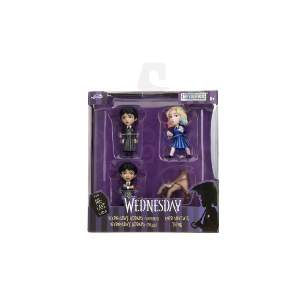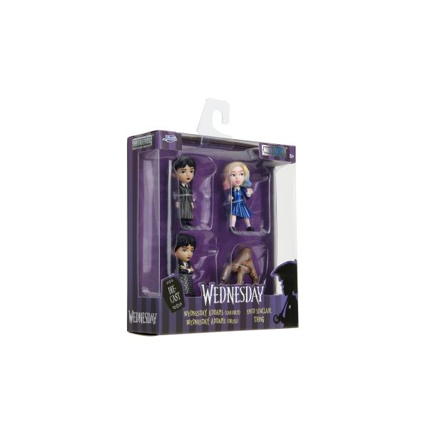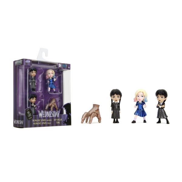 Sada 4 kovových figurek z filmu „Wednesday“ o velikosti 6 cm. Postavy: Wednesday „pruhy“, Vec, Wednesday „tečky“, Enid.