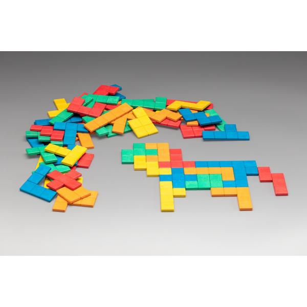 Pentomina jsou vyrobena z recyklovaného dřeva v pestrých barvách – červené, zelené, modré, oranžové a žluté. Vyrobeno z pevného 100% recyklovaného dřeva s certifikací PEFC, které je po použití opakovaně recyklovatelné, a zabaleno v kartonové krabičce.