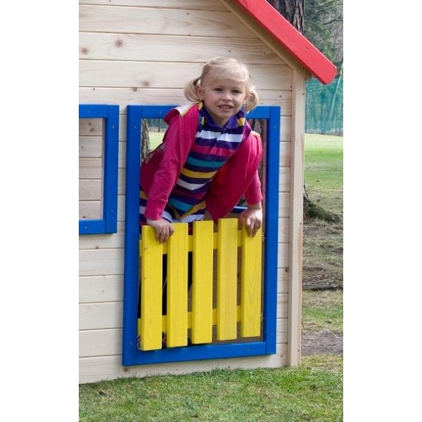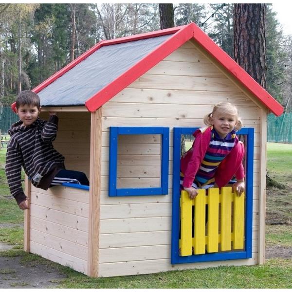 Domeček je v přírodních barvách s barevným lemováním kolem oken a dveří.