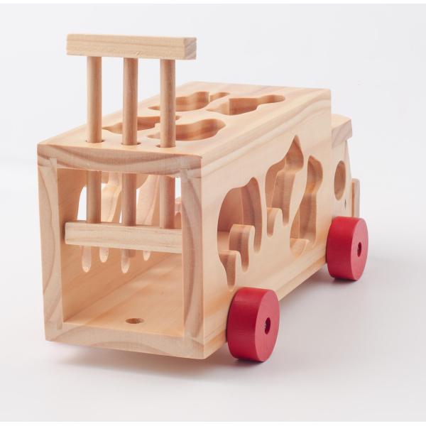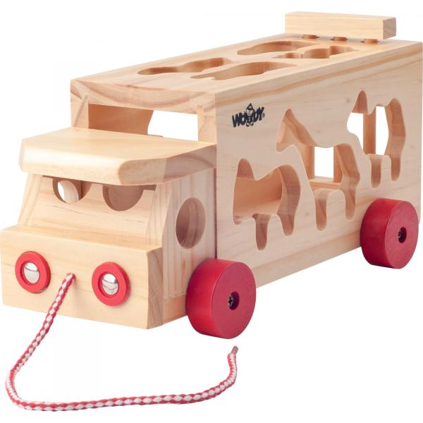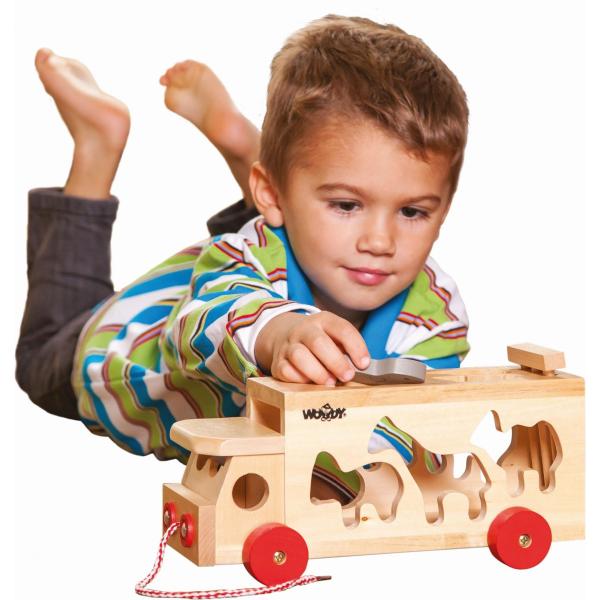 Kamion s vkládacími tvary – zvířátka, výrobce Woody. Vkládací kamion se zvířátky učí dítě znát tvary zvířátek a vkládat je do patřičných otvorů. Hračka je také určena pro rozvoj motoriky. Obsahuje také provázek na tažení, takže se s ním děti opravdu vyhrají. Aby děti zvířátka z korby vybrali, musí vysunout zadní část nahoru. Rozměr: 29 × 14 × 24,5 cm. Certifikát Safe Toys – bezpečná hračka. Vhodné pro děti od 3 let. Materiál: dřevo. Barvy jsou nezávadné. WOODY produkt klade velký důraz vedle vysoké kvalitě a bezpečnosti, také na rozvoj dítěte v různém období růstu, jak po stránce motorické, tak i pedagogické a psychické. Pro děti od 3 let